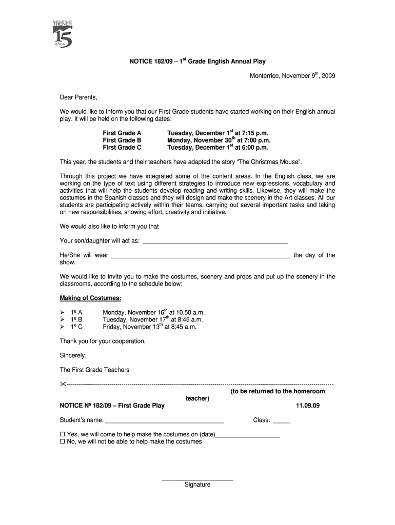 Get the free NOTICE 182/09 1st Grade English Annual Play Monterrico, November 9th, 2009 Dear Pare...