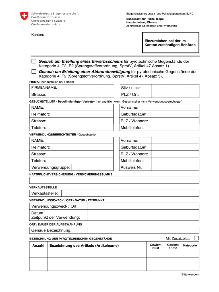 Edge switches Justin- UND Polizeidepartement EJP Bundesrat f r Police fed pol Hauptabteilung Denote Zentralstelle Sprengstoff UND Pyrotechnic Canton: Einzureichen BEI her I'm Canton must antigen BEH