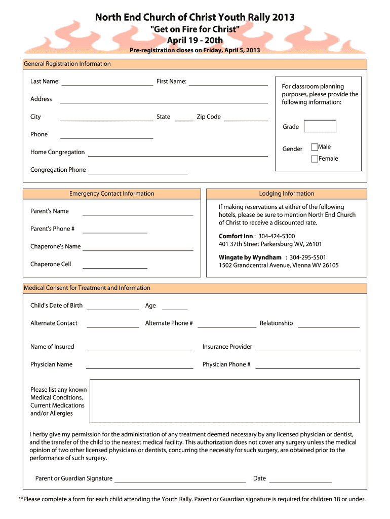 North End Church of Christ Youth Rally 2013 “Get on Fire for Christ April 19 20th Preregistration closes on Friday, April 5, 2013, General Registration Information First Name: Last Name: For classroom