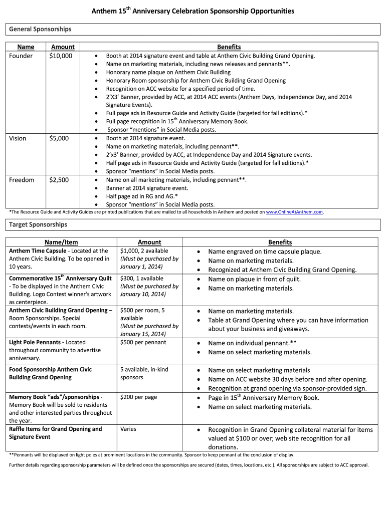 Get the free Anthem 15th Anniversary Celebration Sponsorship Opportunities