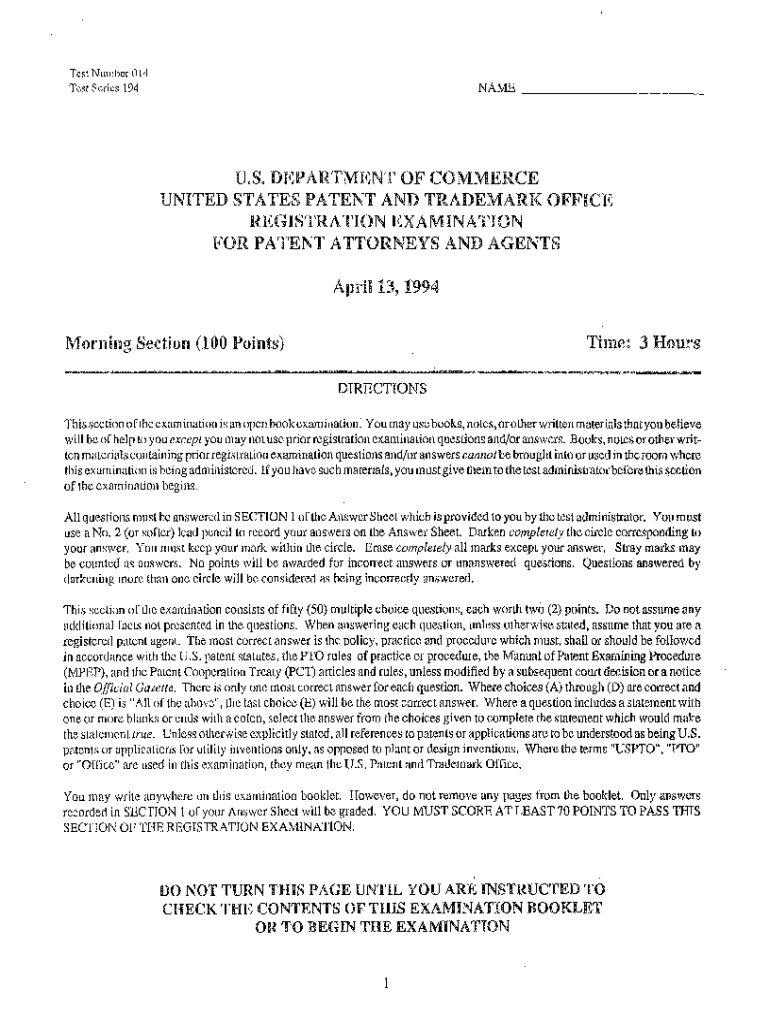 This document serves as the examination paper for the registration examination to become a patent attorney or agent in the U.S. It includes both multiple-choice questions and options for drafting