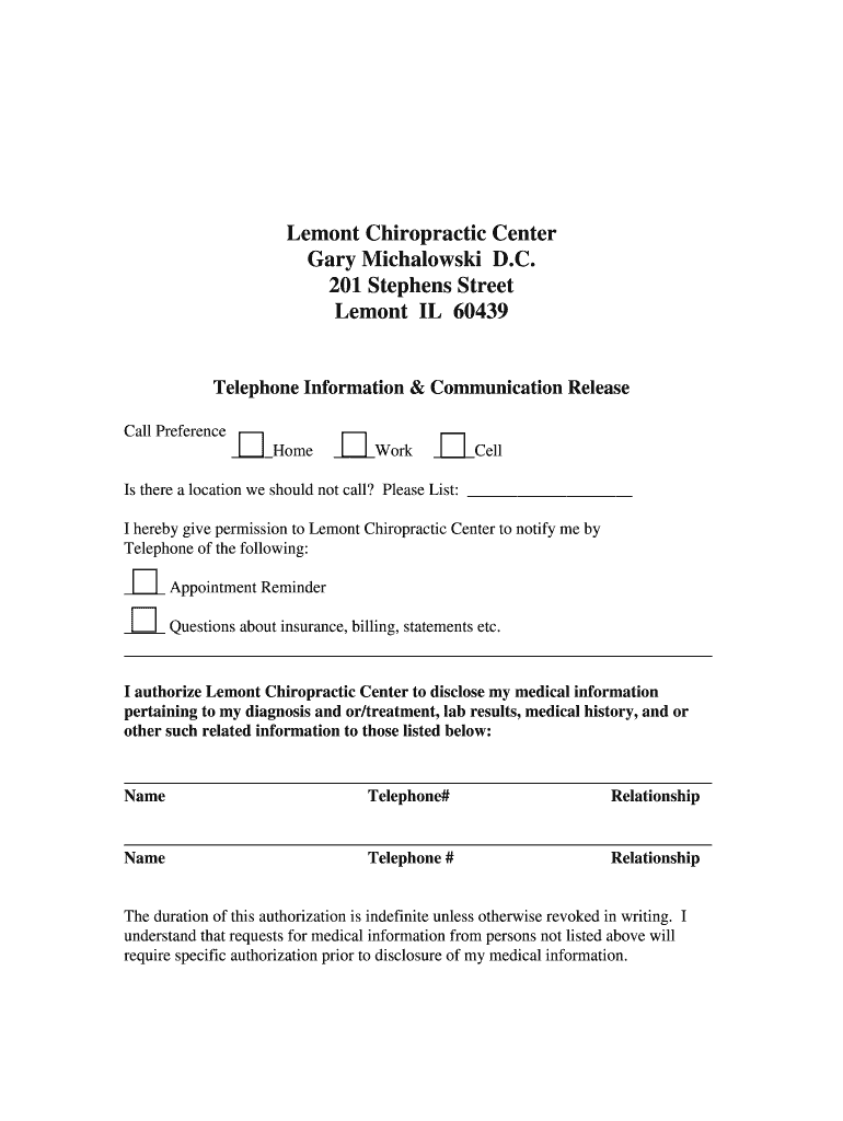 Lemont Chiropractic Center Gary Michalowski D.C. 201 Stephens Street Lemont IL 60439 Telephone Information & Communication Release Call Preference Homework Cell Is there a location we should not call?