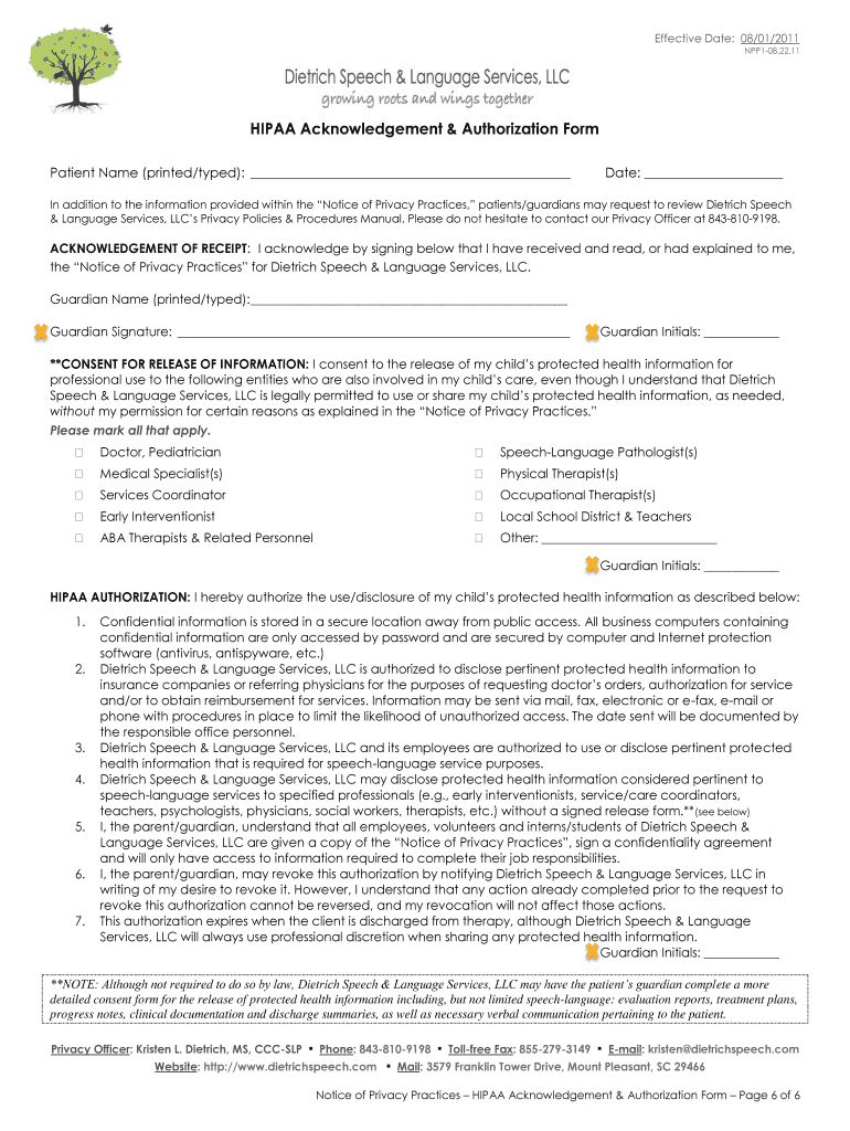 Get the free BHIPAA Formb - Dietrich Speech amp Language Services LLC