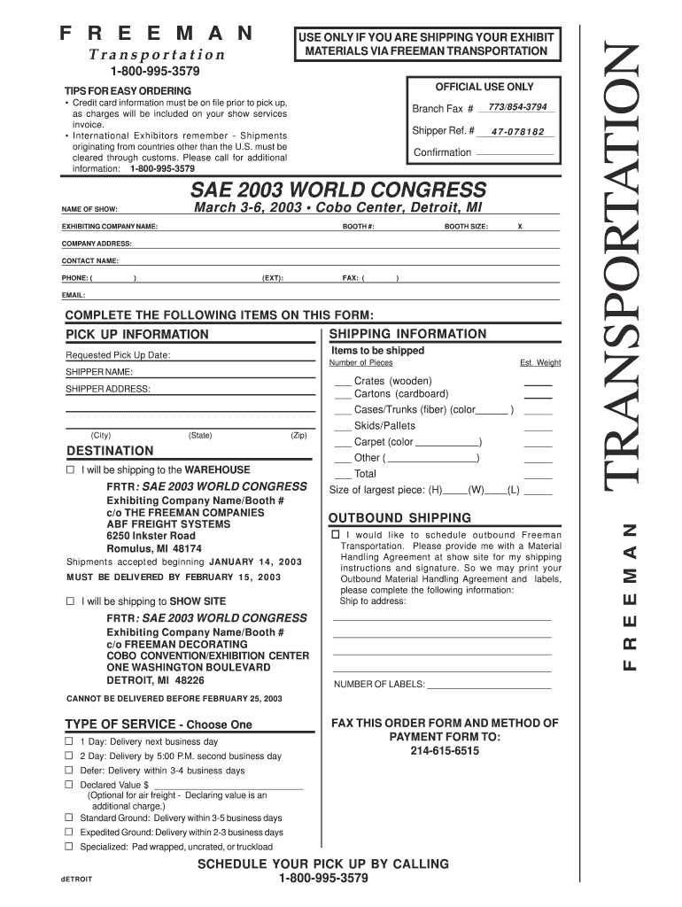 The Freeman Transportation Shipping Form is a crucial document for exhibiting companies participating in events like the SAE 2003 World Congress. This form allows these companies to efficiently manage the shipping of materials to and from the venue. By completing this form, exhibitors ensure that their items reach their destination on time and in proper condition.