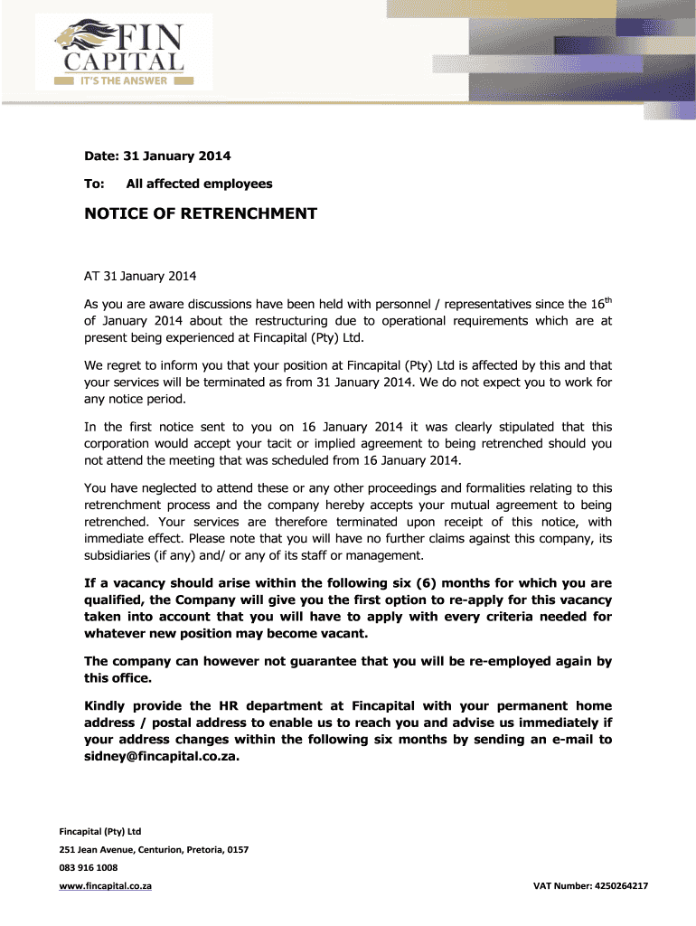 Date: 31 January 2014 To: All affected employees NOTICE OF RETRENCHMENT AT 31 January 2014 As you are aware discussions have been held with personnel / representatives since the 16th of January 2014