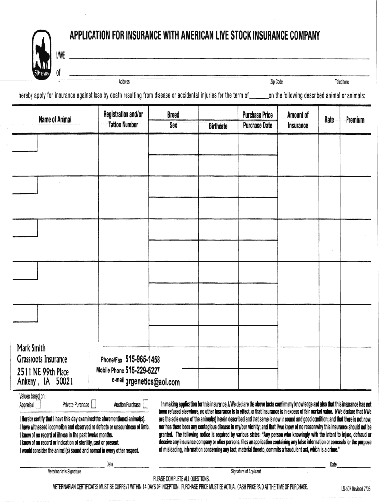 APPLICATION FOR INSURANCE WITH AMERICAN LIVE STOCK INSURANCE COMPANY I/WE of Address Zip Code hereby apply for insurance against loss by death resulting from disease or accidental injuries for the