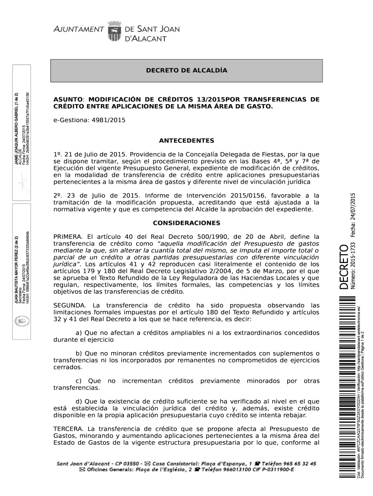 AUNT: MODIFICATION DE CREDITS 13/2015POR TRANSFERENTIAL DE CREDIT ENTIRE APPLICATIONS DE LA MIASMA REA DE GUSTO. Election: 4981/2015 ANTECEDENTS 2. 23 de Julio de 2015. Informed DE Intervention 2015/0156,