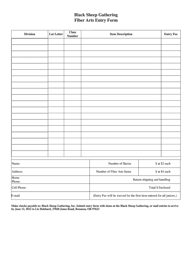 Black Sheep Gathering Fiber Arts Entry Form Lot Letter Division Class Number Name:Address:Entry Renumber of Fiber Arts Items at $2 each at $4 beachcomber of ...