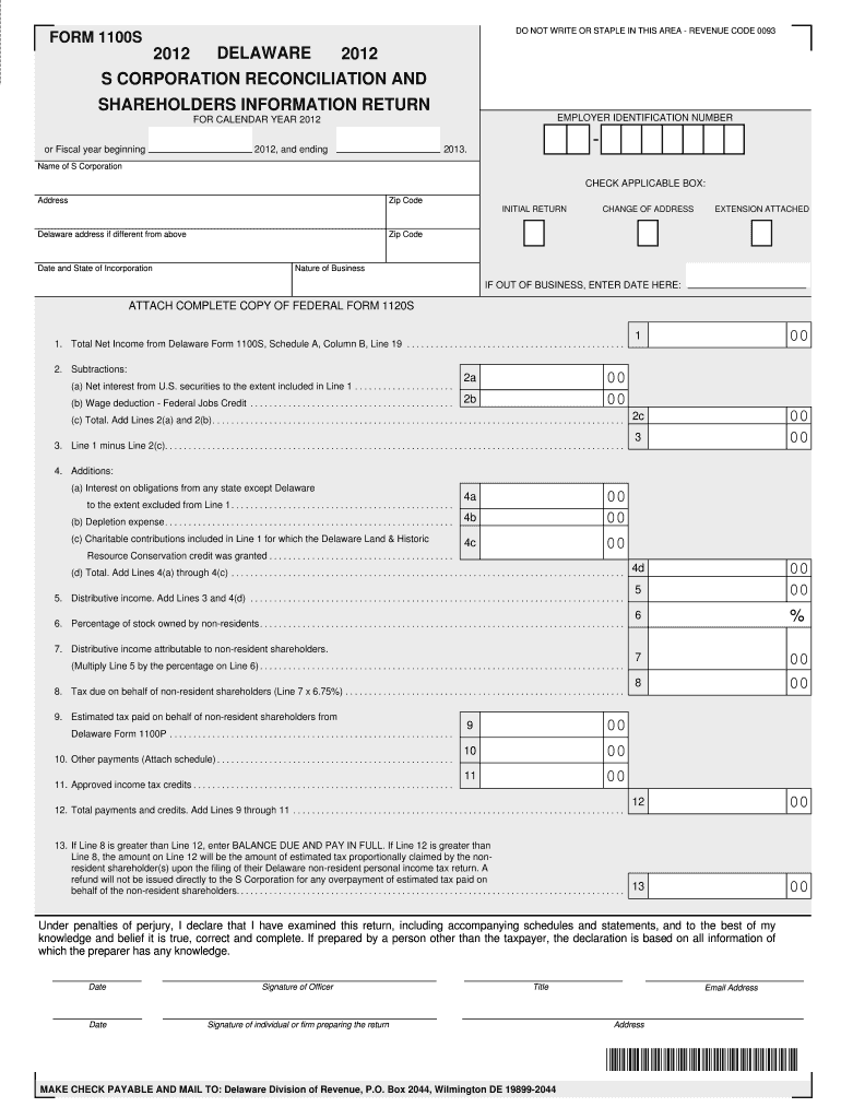 This form is used by S Corporations in Delaware to reconcile their income and report shareholder information for the calendar year 2012 or fiscal year beginning in 2012 and ending in 2013.