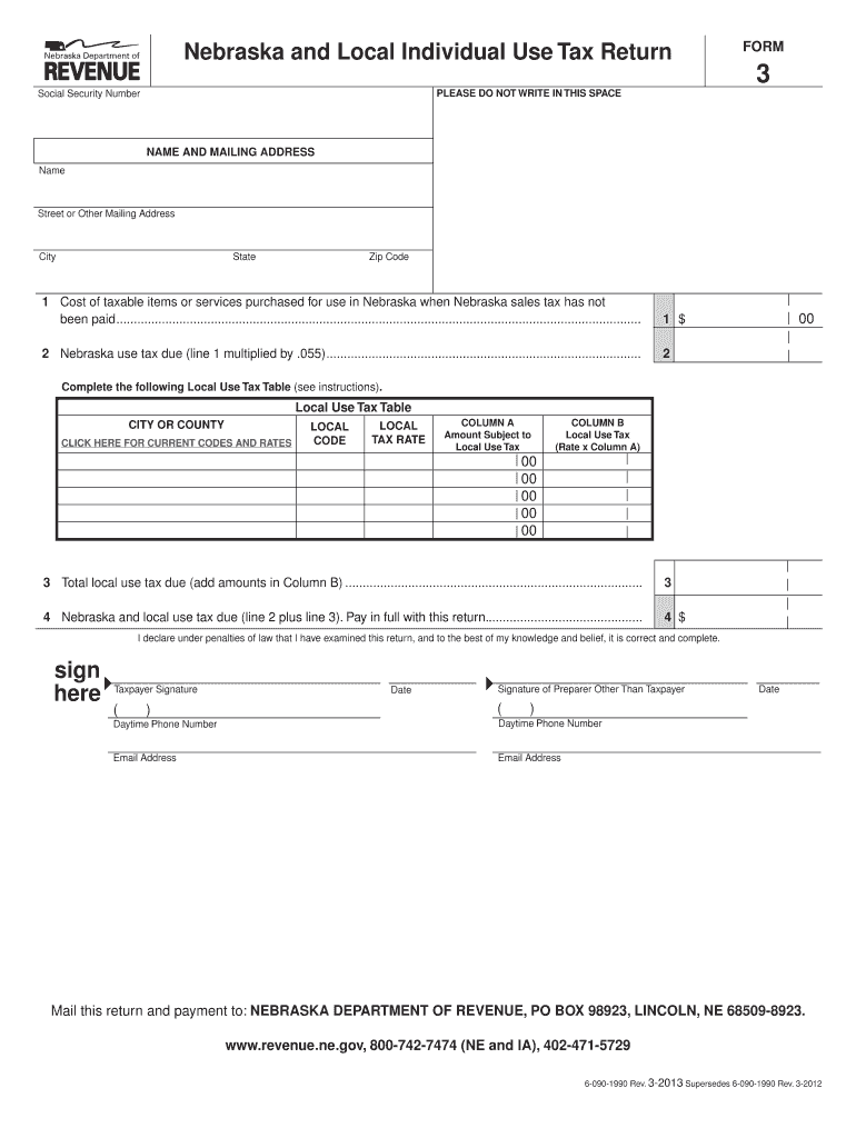 The use tax rate is exactly the same as the state and local sales tax rate where you reside in Nebraska. Individual state and local use tax may be reported and paid: On line 41 of the Nebraska Individual Income Tax Return, Form 1040N; or. By using the Nebraska and Local Individual Use Tax Return, Form 3.