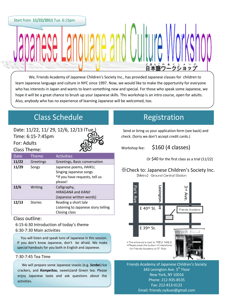 Start from 11/22/2011 Tue. 6:15pm We, Friends Academy of Japanese Children's Society Inc., has provided Japanese classes for children to learn Japanese language and culture in NYC since 1997. Now,