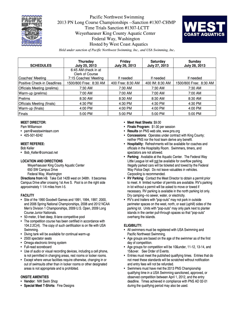 This document outlines the details for the 2013 Pacific Northwest Swimming Long Course Championships, including schedules, eligibility, entry information, meet rules, officials application, and various