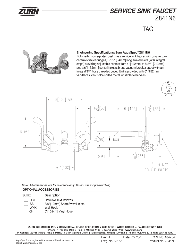 Get the free SERVICE SINK FAUCET Z841N6 TAG Engineering Specifications: Zurn AquaSpec Z841N6 Poli...