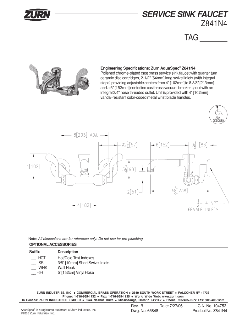 SERVICE SINK FAUCET Z841N4 TAG Engineering Specifications: Turn Aquatic Z841N4 Polished chrome plated cast brass service sink faucet with quarter turn ceramic disc cartridges, 21/2 64 mm long swivel