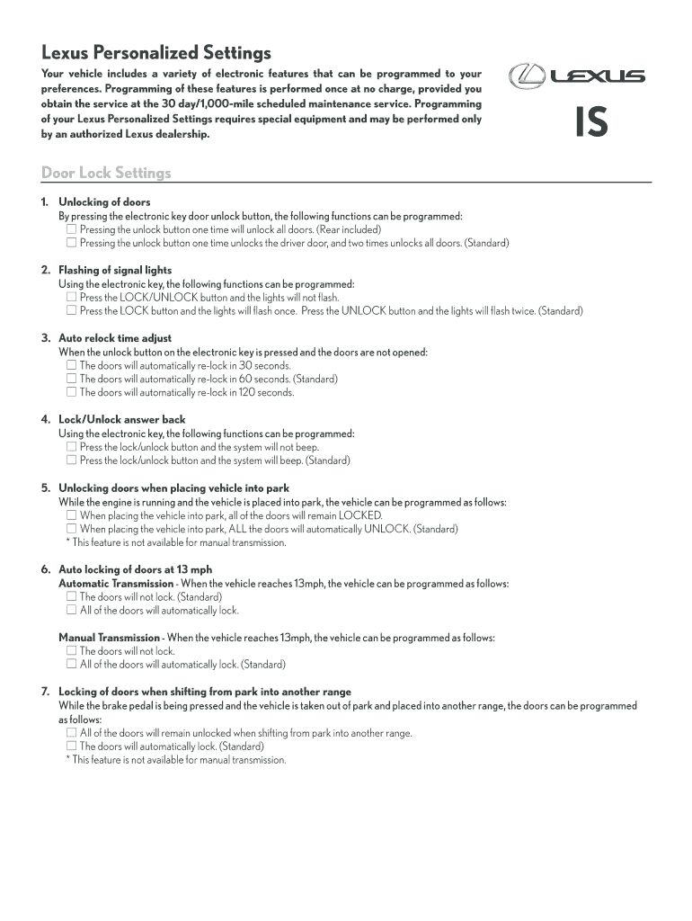 The Lexus Personalized Settings Form is a business document used by Lexus vehicle owners to customize electronic features of their vehicle.