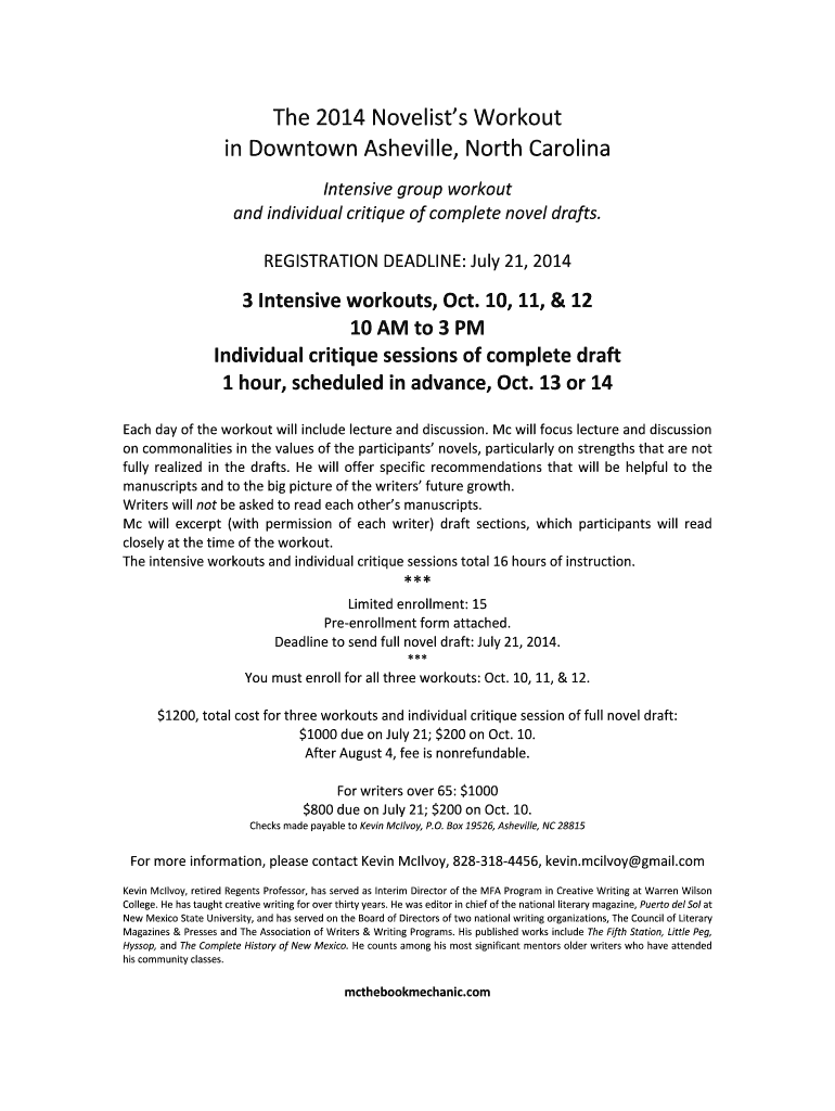 The 2014 Novelists Workout in Downtown Asheville, North Carolina Intensive group workout and individual critique of complete novel drafts. REGISTRATION DEADLINE: July 21, 2014 3 Intensive workouts,