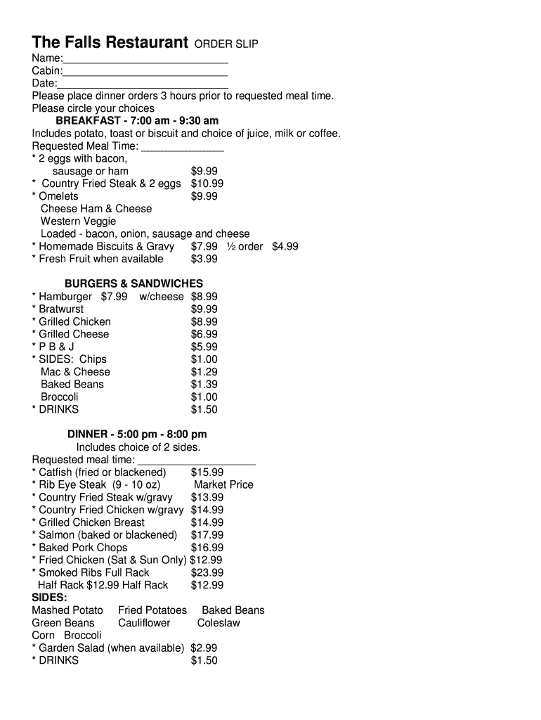 The Falls Restaurant ORDER SLIP Name: Cabin: Date: Please place dinner orders 3 hours prior to requested meal time. Please circle your choices BREAKFAST 7:00 am 9:30 am Includes potato, toast or biscuit