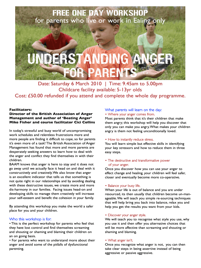 FREE ONE DAY WORKSHOP for parents who live or work in Dealing only UNDERSTANDING ANGER FOR PARENTS Date: Saturday 6 March 2010 Time: 9.45am to 5.00pm Childcare facility available: 513yr olds Cost:
