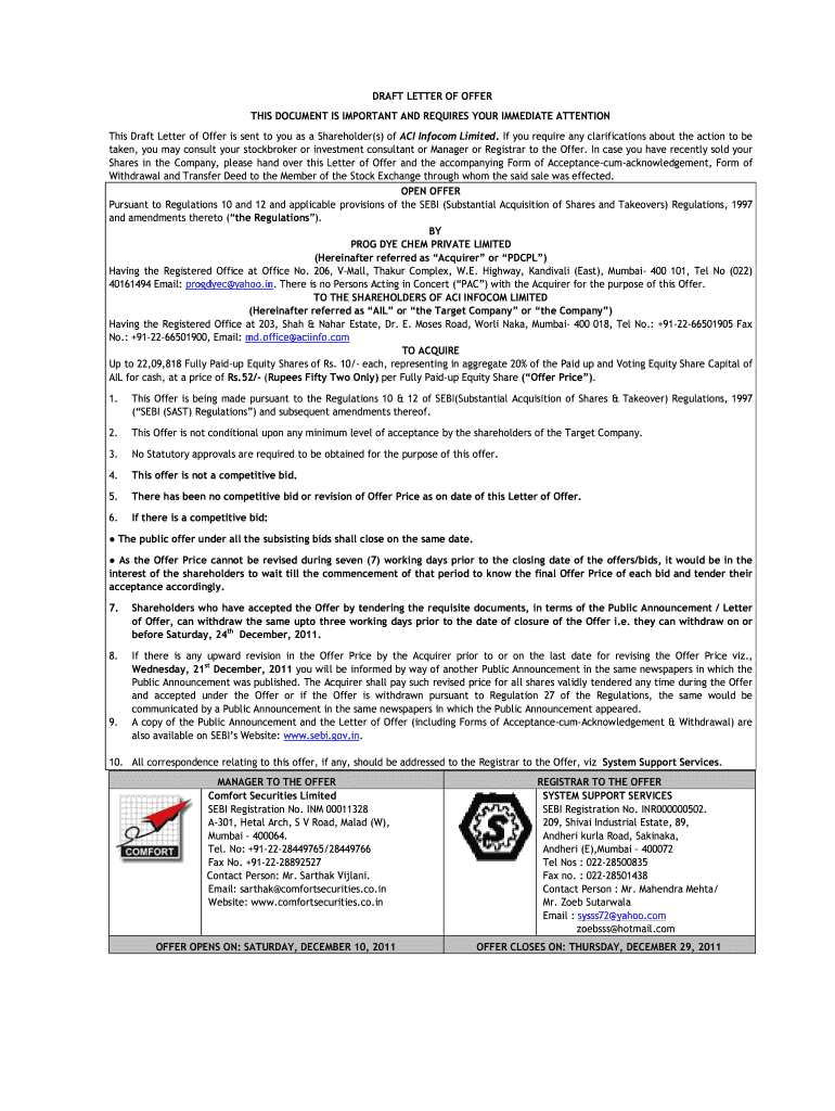 Get the free ACI Letter of Offer 31.10.11.doc - sebi gov