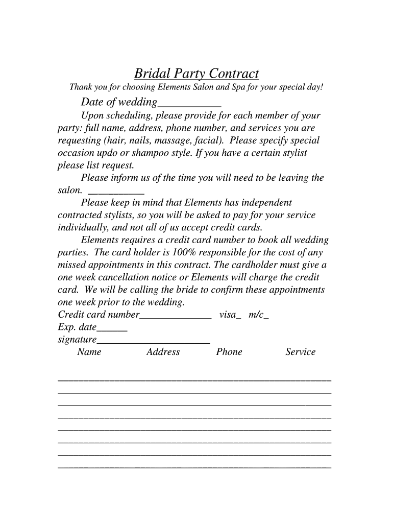 Bridal Party Contract Thank you for choosing Elements Salon and Spa for your special day! Date of wedding Upon scheduling, please provide for each member of your party: full name, address, phone number,