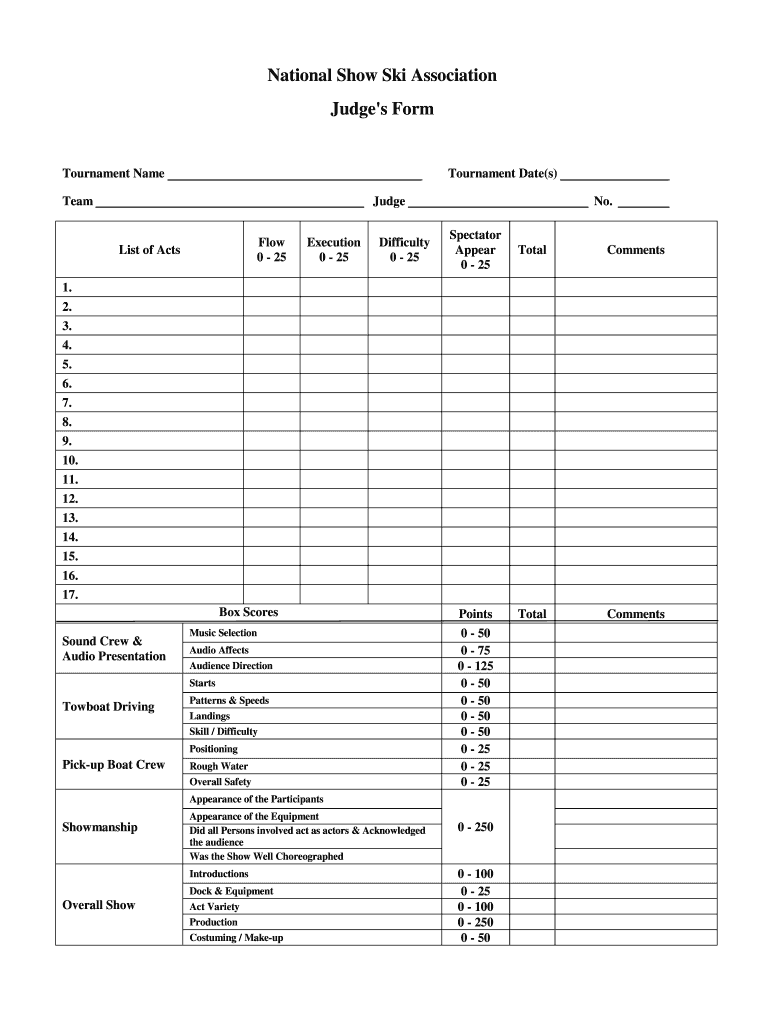National Show Ski Association Judge's Form Tournament Name Tournament Date(s) Team Judge Flow 0 25 List of Acts Execution 0 25 Difficulty 0 25 No. Spectator Appear 0 25 Total Comments 1. 2. 3. 4.