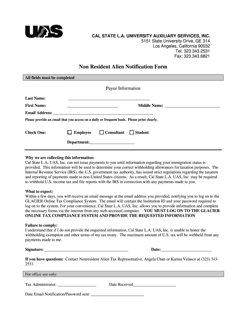 PRINT CAL STATE L.A. UNIVERSITY AUXILIARY SERVICES, INC. 5151 State University Drive, GE 314 Los Angeles, California 90032 Tel: 323.343.2531 Fax: 323.343.6821 CLEAR Non-Resident Alien Notification