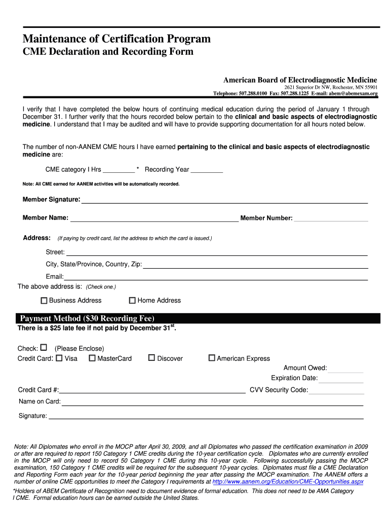 Maintenance of Certification Program CME Declaration and Recording Form American Board of Electrodiagnostic Medicine 2621 Superior Dr NW, Rochester, MN 55901 Telephone: 507.288.0100 Fax: 507.288.1225