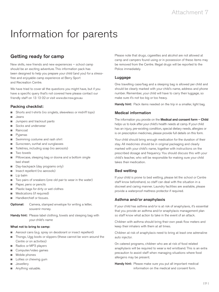 Attachment 7 Information for parents Getting ready for camp New skills, new friends and new experiences school camp should be an exciting adventure. This information pack has been designed to help