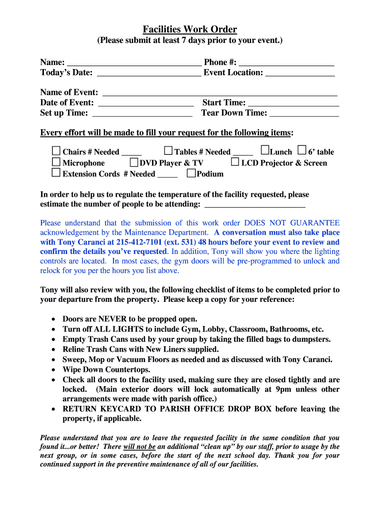 Facilities Work Order (Please submit at least 7 days prior to your event.) Name: Phone #: Today's Date: Event Location: Name of Event: Date of Event: Start Time: Set up Time: Tear Downtime: Every