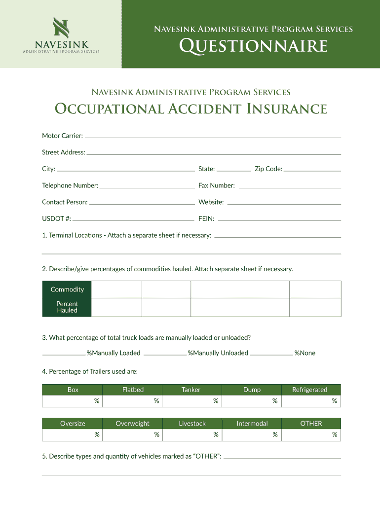 Nave sink Administrative Program Services Questionnaire Nave sink Administrative Program Services Occupational Accident Insurance Motor Carrier: Street Address: City: State: Telephone Number: Fax