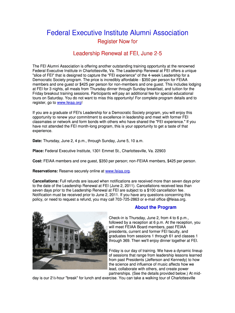 The FEI Alumni Association offers a training opportunity at the Federal Executive Institute to renew leadership skills, network with alumni, and experience the FEI program.
