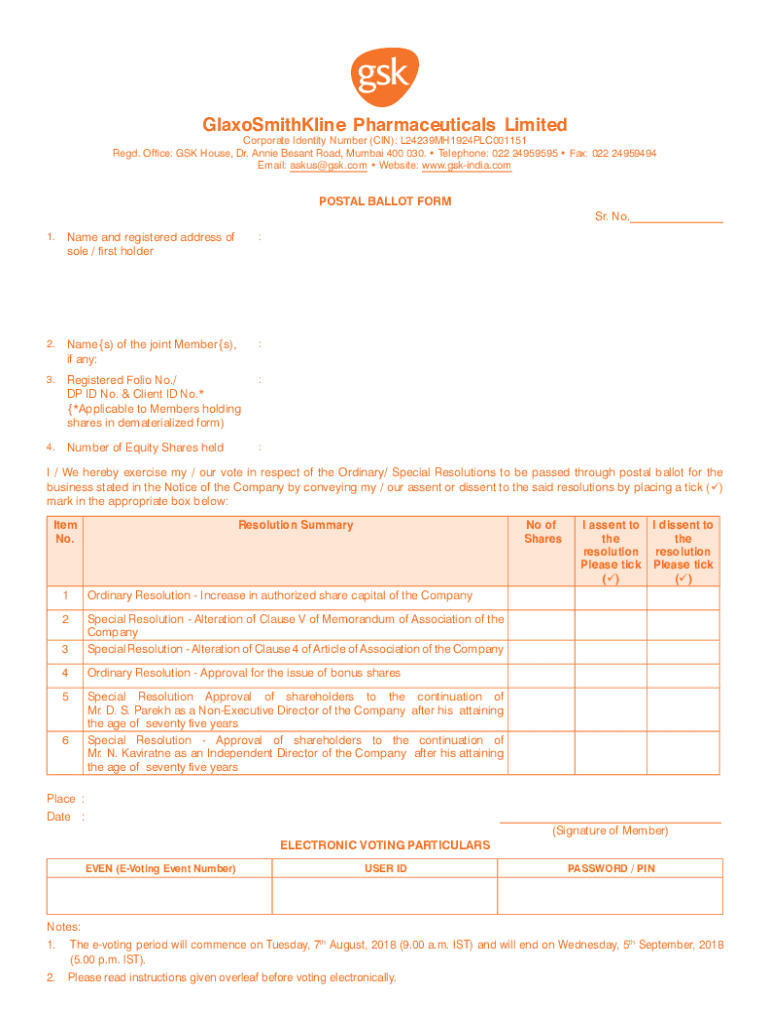 GlaxoSmithKline Pharmaceuticals LimitedCorporate Identity Number (IN): L24239MH1924PLC001151 Red. Office: GSK House, Dr. Annie Began Road, Mumbai 400 030. Telephone: 022 24959595 Fax: 022 24959494