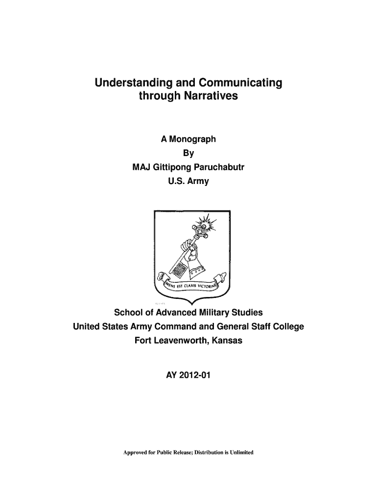 This monograph analyzes the concept of narrative within military operations, emphasizing its importance as a methodology for understanding and communication, and makes recommendations for its application