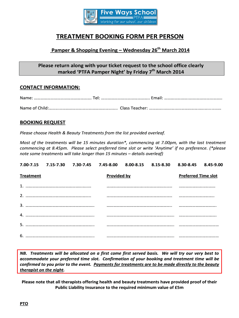 Get the free T REATMENT BOOKING FORM PER PERSON - Five Ways bPrimaryb bSchoolb - fiveways-primary...