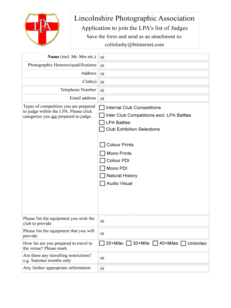 Lincolnshire Photographic Association Application to join the PA's list of Judges Save the form and send as an attachment to: colinlusby btinternet.com Name (incl. Mr. Mrs etc.) Photographic Honors/qualifications