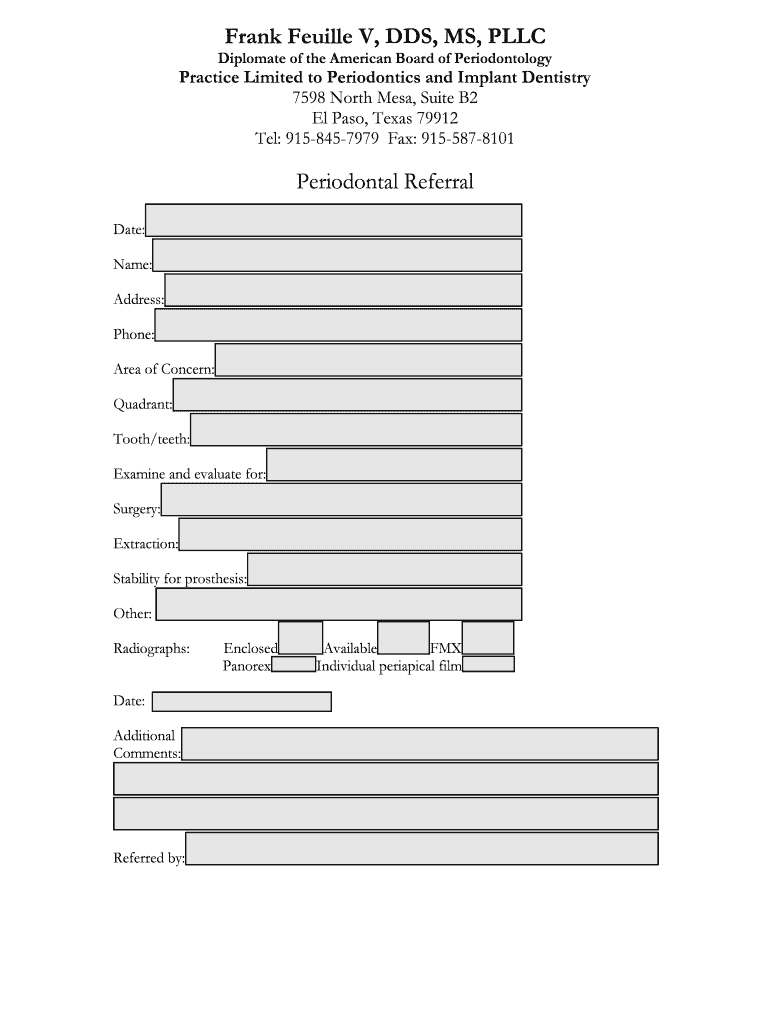 Frank Seville V, DDS, MS, LLC. Diplomat of the American Board of Period ontology. Practice Limited to Periodontics and Implant Dentistry. 7598 North Mesa, Suite B2