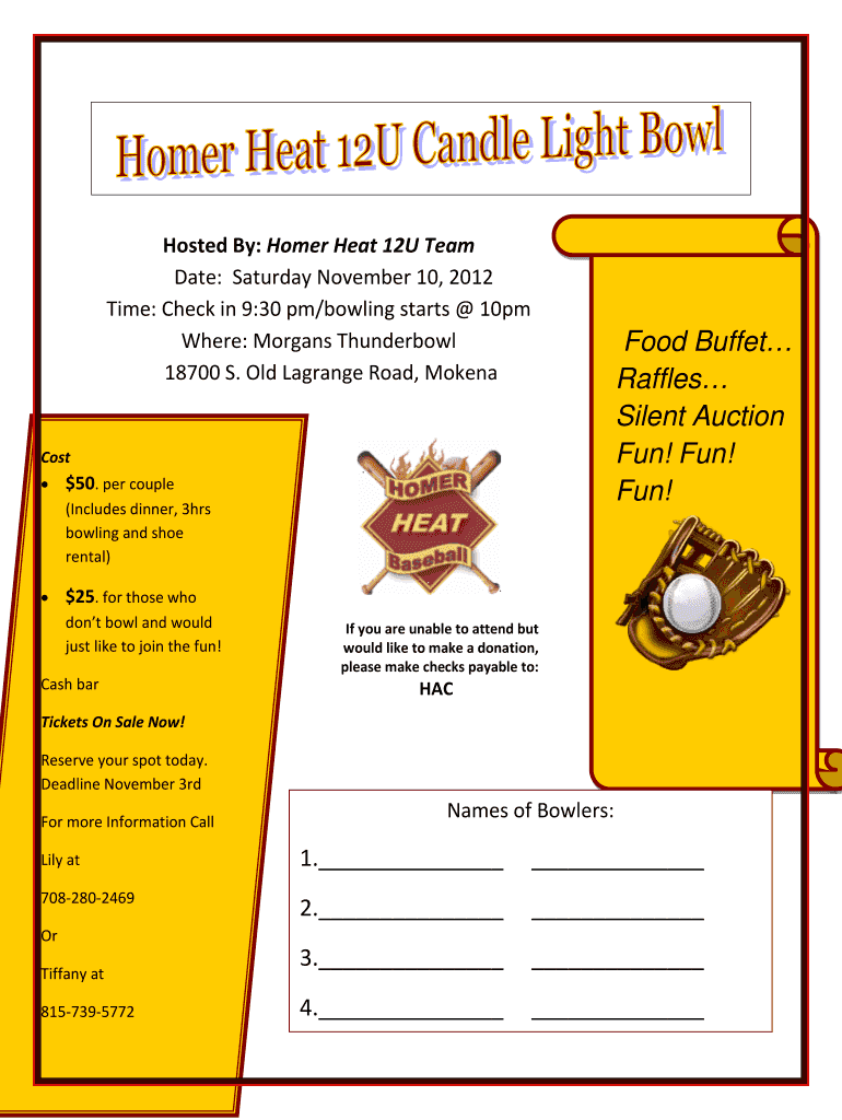 Hosted By: Homer Heat 12U Team Date: Saturday, November 10, 2012, Time: Check in 9:30 pm/bowling starts 10pm Where: Morgans Thunder bowl 18700 S. Old Lagrange Road, Modena Food Buffet Raffles Silent