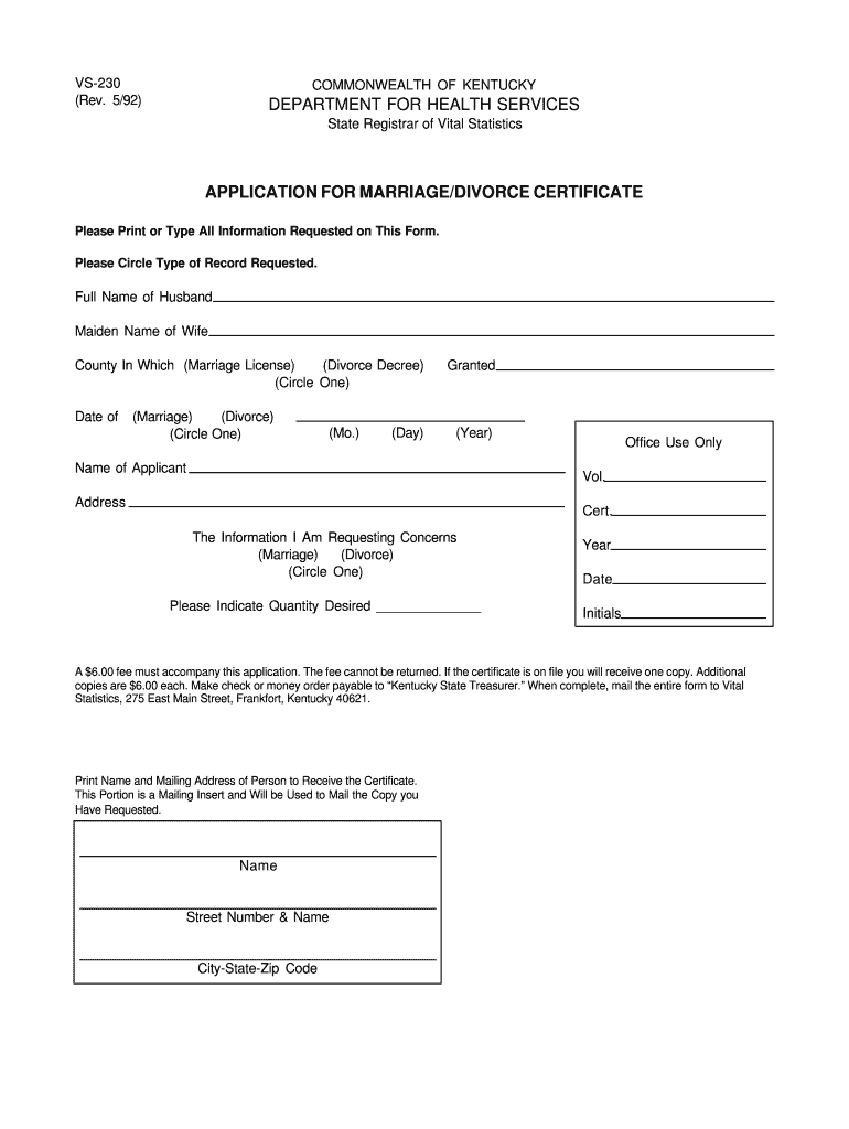 VS230 (Rev. 5/92) COMMONWEALTH OF KENTUCKY DEPARTMENT FOR HEALTH SERVICES State Registrar of Vital Statistics APPLICATION FOR MARRIAGE/DIVORCE CERTIFICATE Please Print or Type All Information Requested