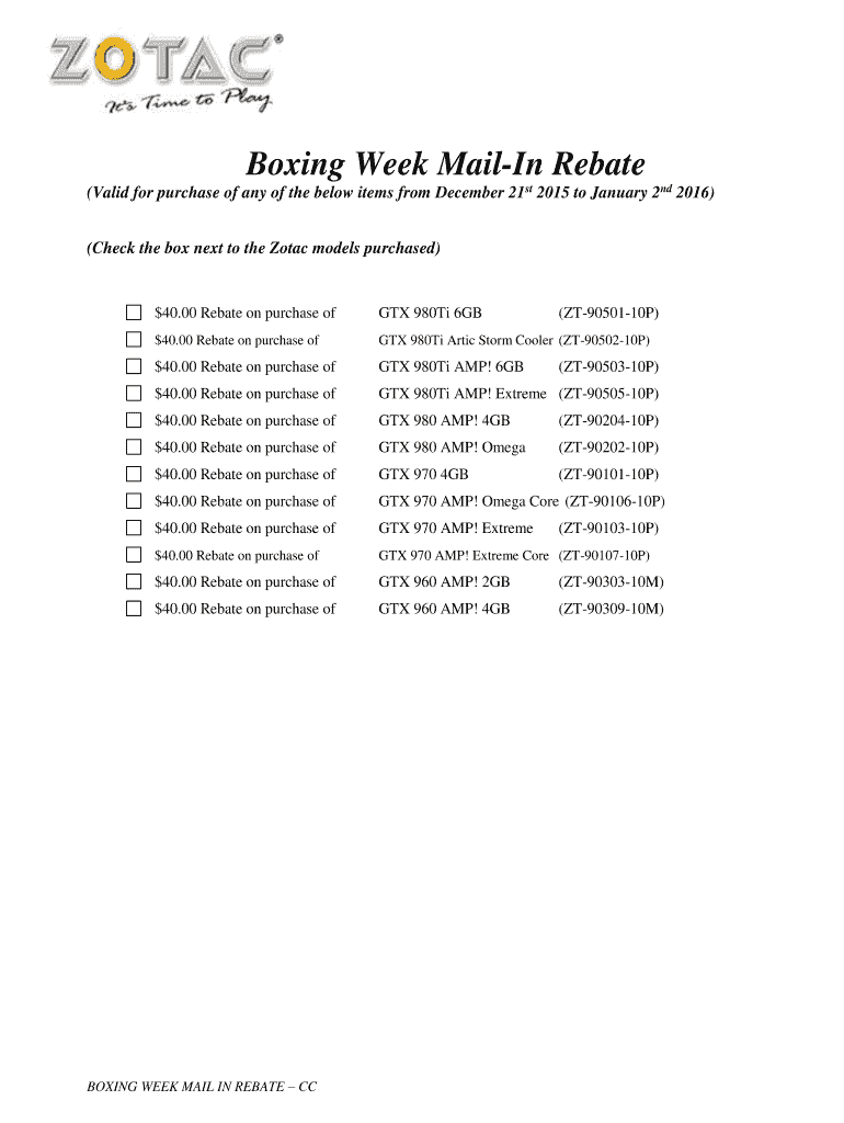 Boxing Week Mailing Rebate (Valid for purchase of the below items from December 21st 2015 to January 2nd 2016) (Check the box next to the Total models purchased) $40.00 Rebate on purchase of GTX 980Ti