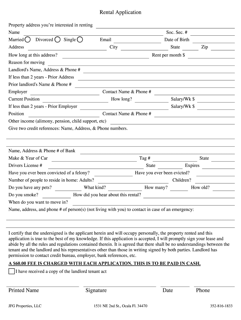 Rental Application Property address you're interested in renting Name Married Soc. Sec. # Divorced Single Email Address Date of Birth City State How long at this address? Zip Rent per month $ Reason