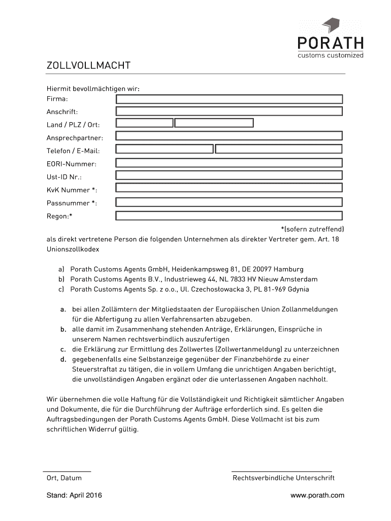 Holen Sie sich kostenlos Zollvollmacht - Porath Customs Agents