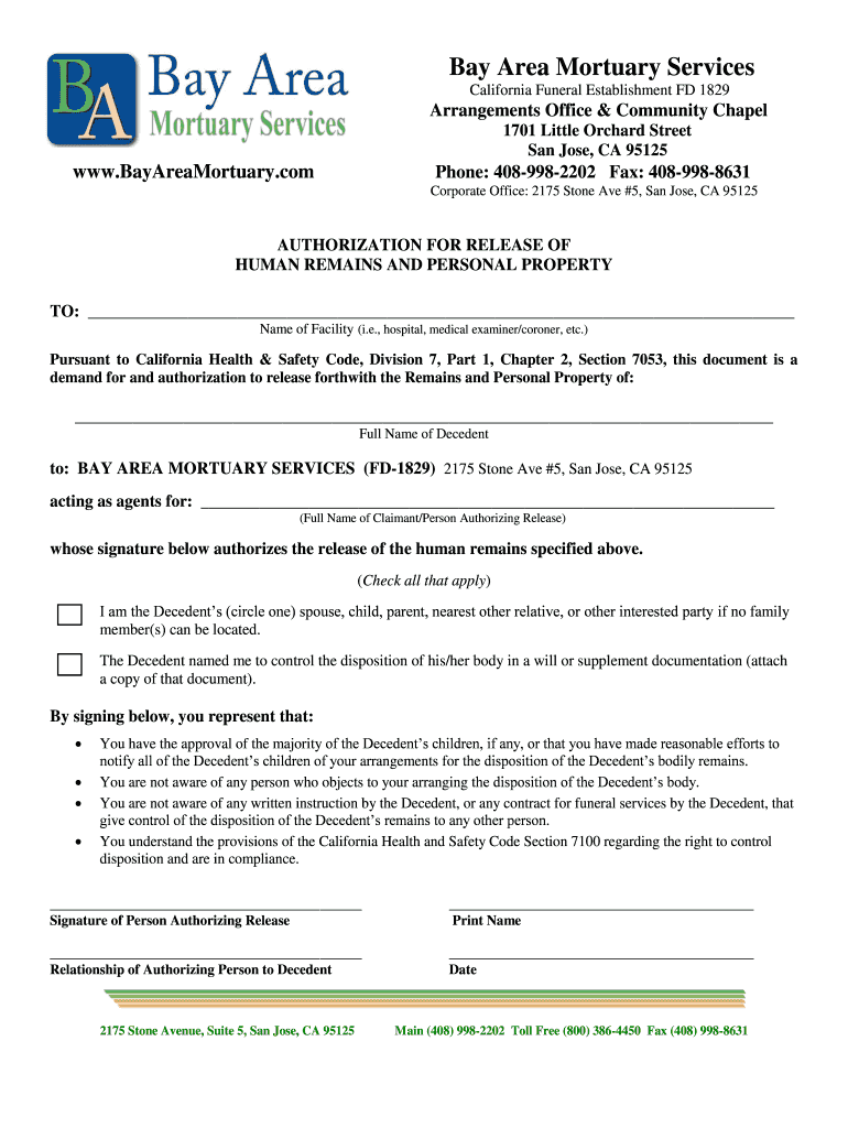 This document authorizes the release of human remains and personal property of a decedent to Bay Area Mortuary Services, complying with California Health & Safety Code regulations.