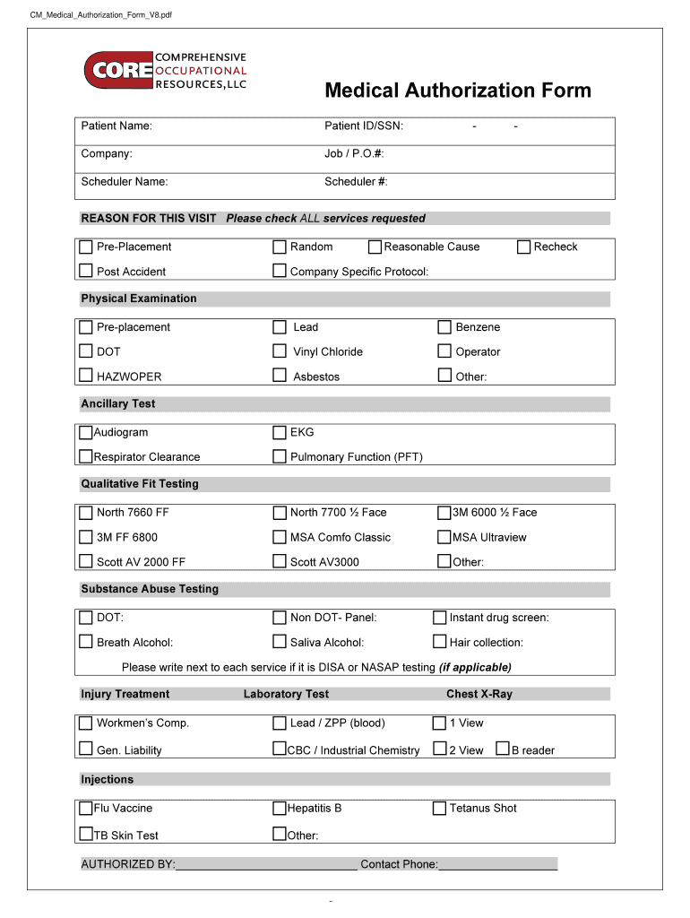 CM Medical Authorization Form V8.pdf Medical Authorization Form Patient Name: Patient ID/SSN: Company: Job / P.O.#: Scheduler Name: Scheduler #: — — REASON FOR THIS VISIT Please check ALL services