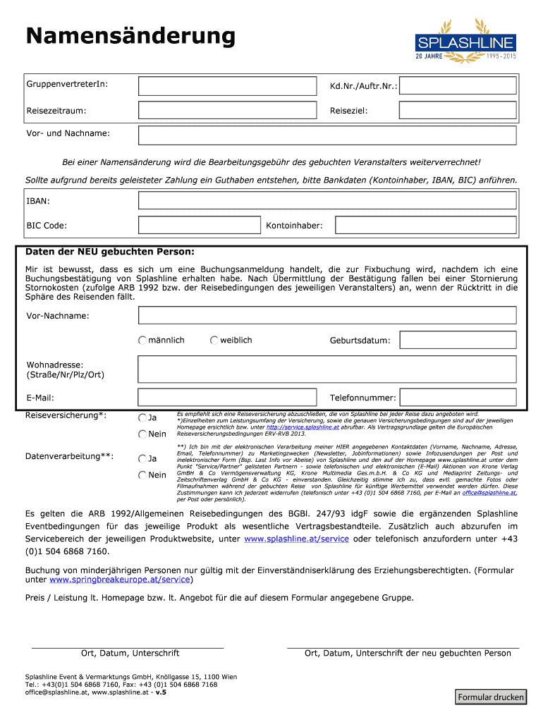 Namensnderung GruppenvertreterIn: KD. NR./Aught. NR.: Reisezeitraum: Material: VOR UND Nickname: BEI anger Namensnderung word die Bearbeitungsgebhr DES lebkuchen Veranstalters weiterverrechnet! Solute