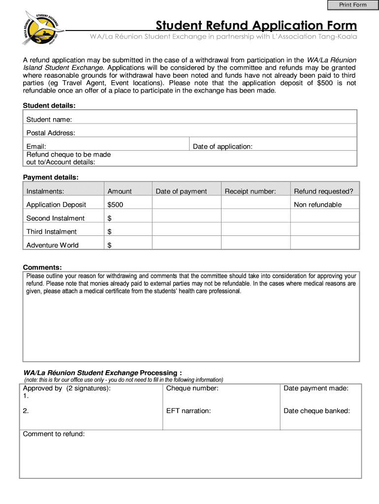 Print Form Student Refund Application Form v WA/La Union Student Exchange in partnership with Association Angola A refund application may be submitted in the case of a withdrawal from participation