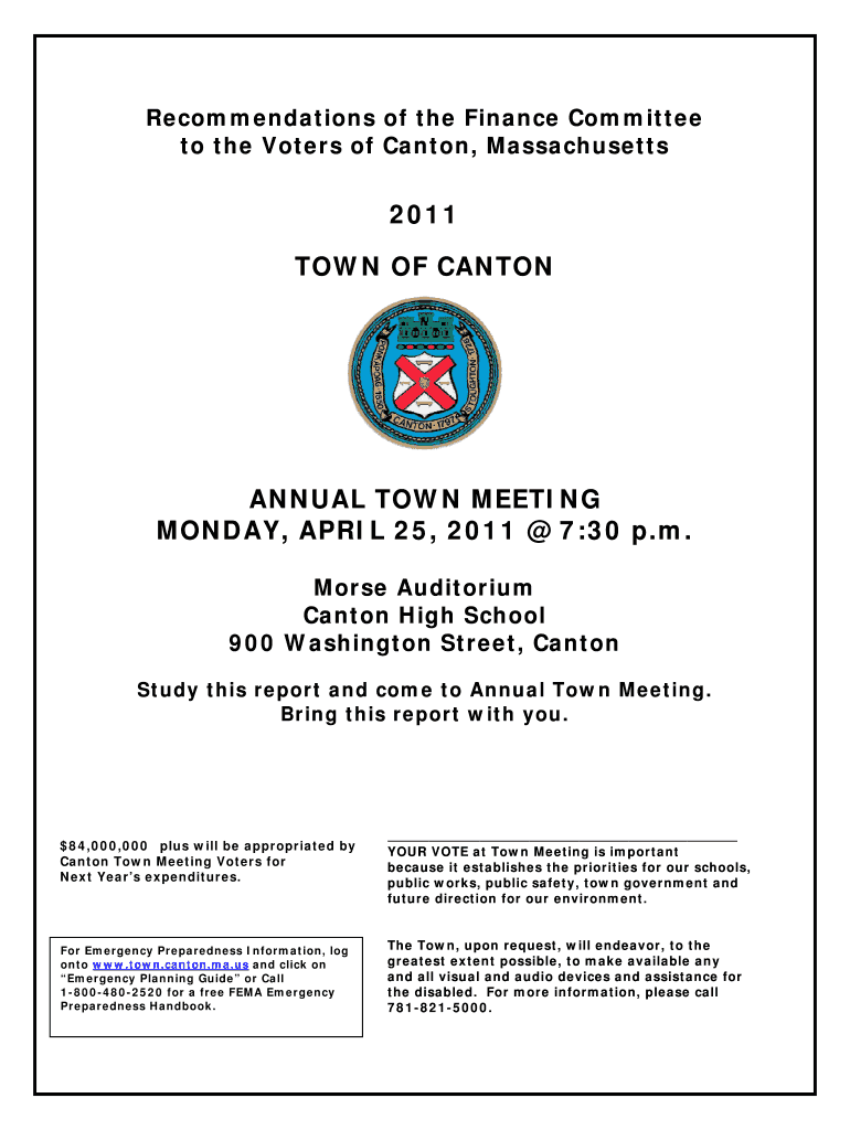Get the free Recommendations of the Finance Committee to the Voters of Canton, Massachusetts - to...