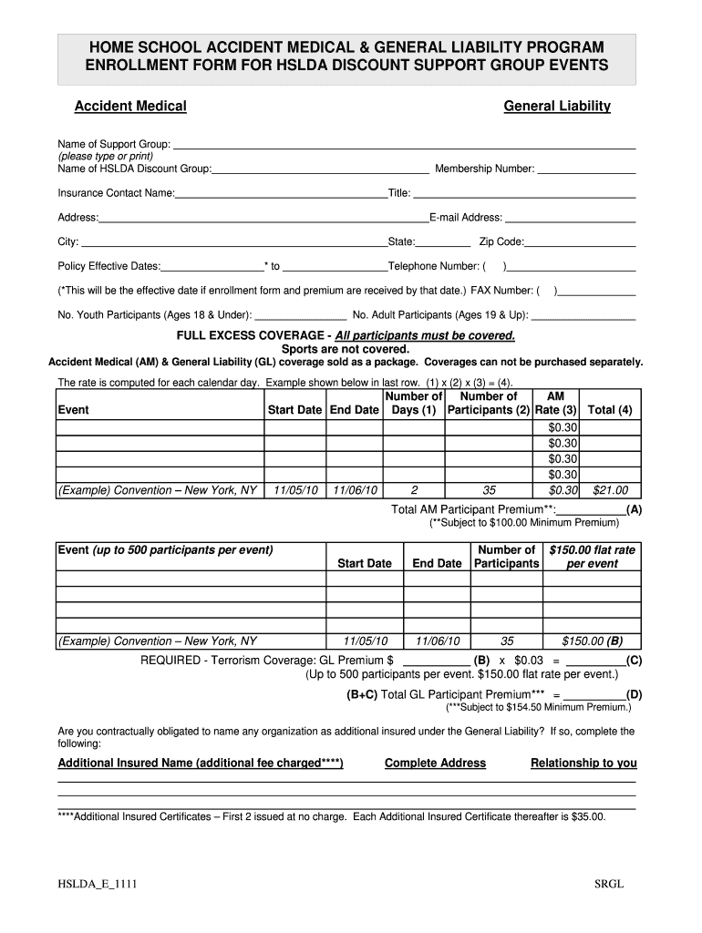This document serves as a form for enrolling in the Home School Accident Medical and General Liability program, specifically for HSLDA Discount Support Group events, outlining coverage details and