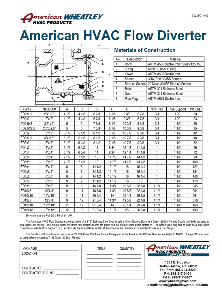 2.003 FD 1009 American HVAC Flow Diverter Materials of Construction No. 1 2 3 4 5 6 7 8 Part # FD2x1.5 FD2x2 FD2.5×2 FD2.5×2.5 FD3x2.5 FD3x3 FD4x3 FD4x4 FD5x4 FD5x5 FD6x4 FD6x5 FD6x6 FD8x6 FD8x8