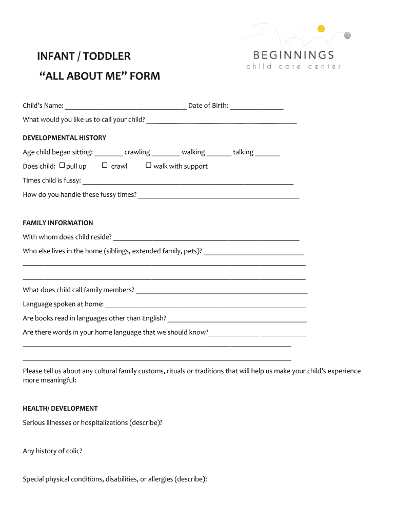 Get the free INFANT TODDLER ALL ABOUT ME FORM