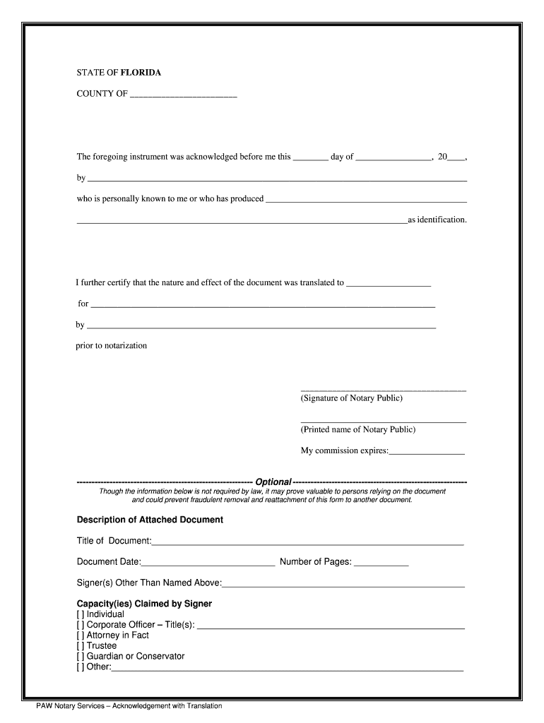 The Florida Notary Acknowledgment with Translation form is a legal document used by notaries public to certify a signer's identity and the translation of a document's nature prior to notarization.